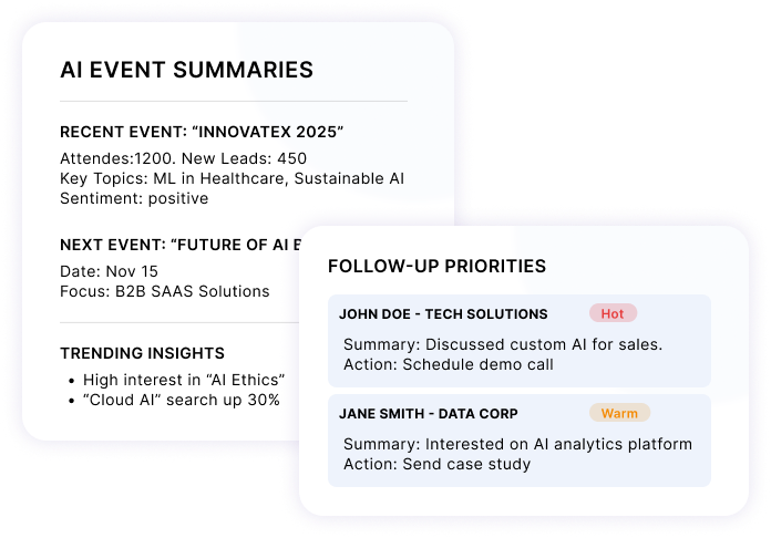 Scan badges, qualify leads, enrich profiles, and sync everything instantly to your CRM. No fishbowls. No cleanup. Just enriched, structured, high-intent leads your sales team can use immediately.